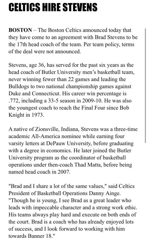 When Danny Ainge hired Stevens to become head coach in 2013-14, this is the press release that was sent out to the NBA and Boston media.