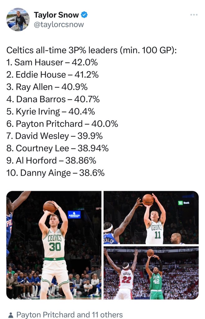 The Boston Celtics have three players on their roster who rank in the top-10 all-time 3-point shooting percentage in franchise history with a minimum of 100 games played with the team.