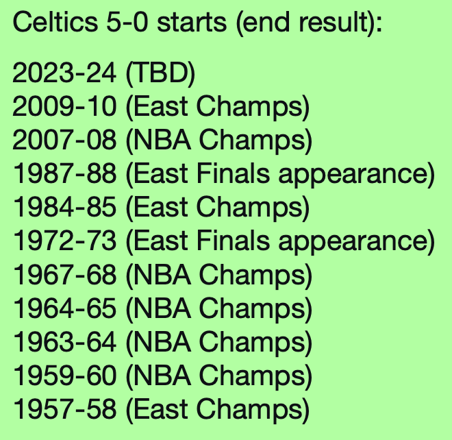 The previous 10 teams in Celtics history hold a pretty great track record after starting out 5-0, making 10 Eastern Conference Finals, eight NBA Finals, and winning five championships.