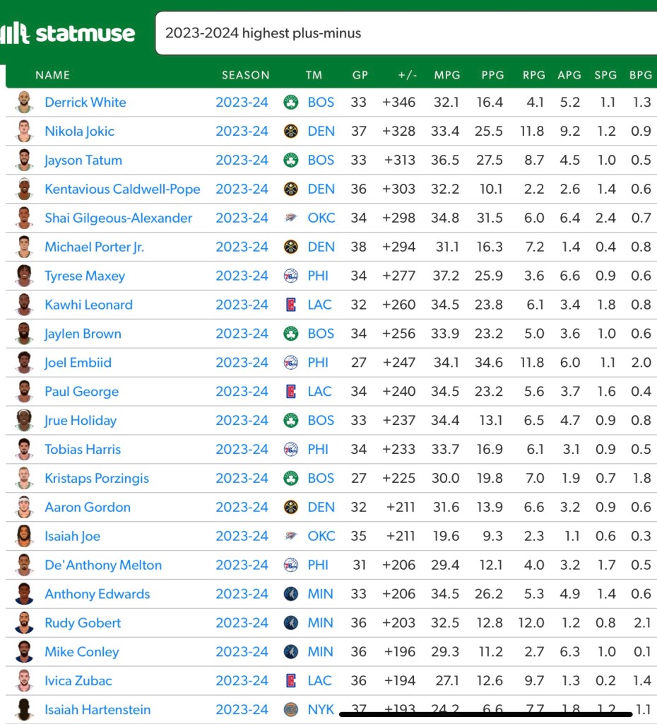 There’s only four players in the league who are a +300 this season and the Celtics have two of them: Derrick White (No. 1) and Jayson Tatum (No. 3). Jaylen Brown (No. 9), Jrue Holiday (No. 12), Kristaps Porzingis (No. 15).