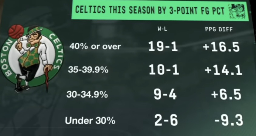 The Celtics are making 16.2 3-pointers per game while attempting 42.7 per game, which is the most in the NBA this season. But the reliance of their 3-point shooting is starting to impact games, against the top teams in the league.
