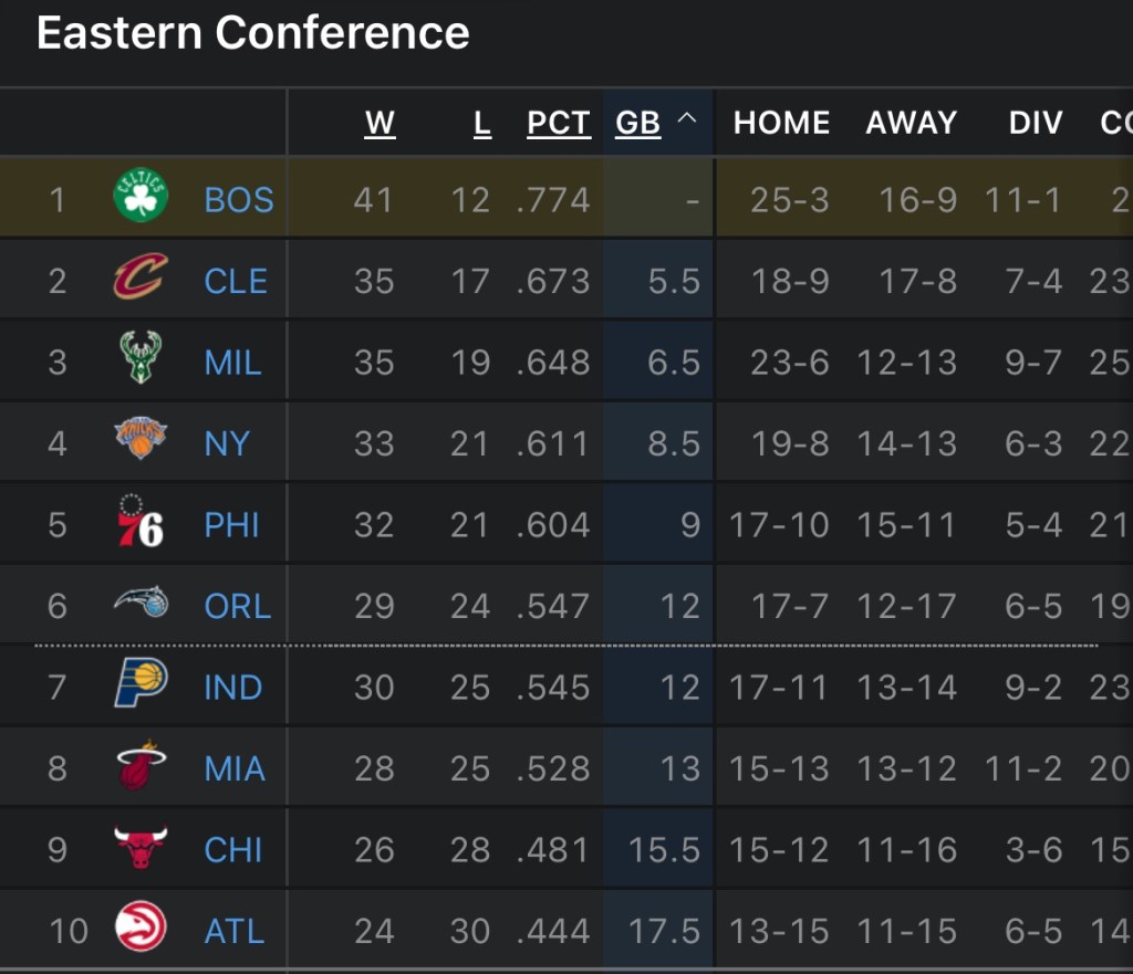 The Boston Celtics have a healthy lead in the Eastern Conference. They have a 41-12 record and a 5.5 game lead with only two games left before the All-Star break.